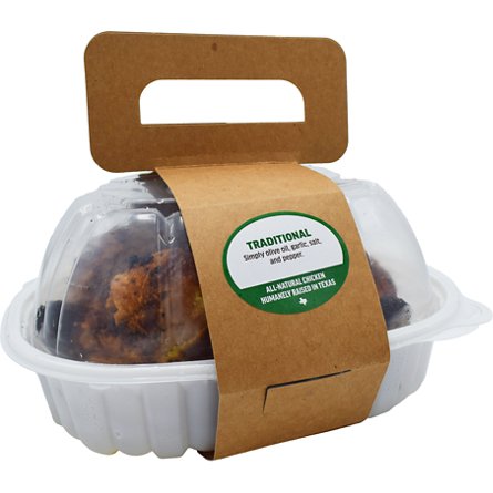 Raised in Gonzales, Texas, on all-natural diets without added hormones, our chickens are fire-roasted multiple times daily in small batches to give you the plumpest, juiciest, freshest rotisserie chickens. We season simply with garlic, salt, olive oil, and black pepper.