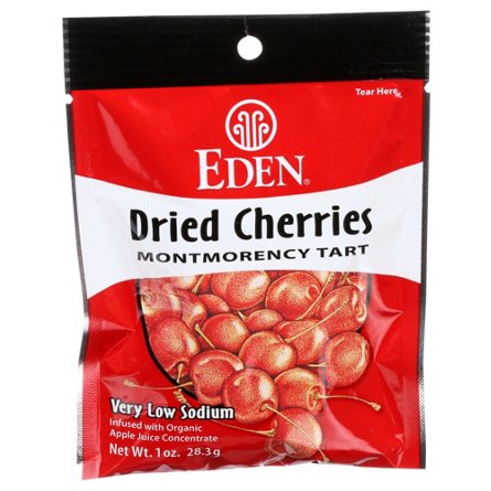 Infused with organic apple juice concentrate. Very low sodium. Tart cherries contain at least 17 antioxidants. Eden tart cherries are infused with organic Eden apple juice concentrate. They contain no other additives whatsoever and are misted with organic safflower oil to prevent clumping.