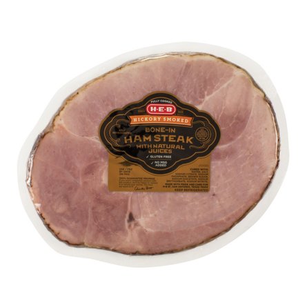 $4.99 / lbAlways great quickly grilled, this H-E-B fully cooked bone-in ham steak can also be heated up on the stovetop or in the oven or microwave. Hickory-smoked for that flavor-packed taste, it's a delicious main course any time of day, whether served with eggs and hash browns or your favorite dinnertime s...