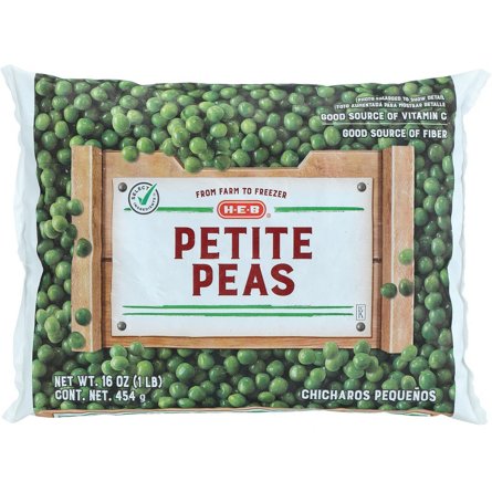 H-E-B frozen petite peas are tender and full of garden-fresh taste. Easy to prepare on the stovetop or in the microwave, they offer a good source of vitamin C and fiber. From tossing them into a fried rice dish to serving them on their own as a side, this frozen veggie comes in handy often.