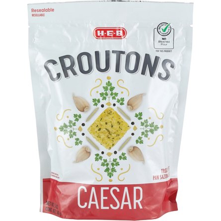Packaged in a resealable bag for freshness, H-E-B Caesar croutons take the usual lettuce salad to a whole new level of tastiness. Seasoned with garlic, parmesan cheese and a blend of spices, these baked bread cubes are not limited to topping only Caesar salads — try sprinkling them onto Greek, chef ...