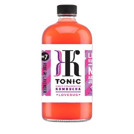 K Tonic Rose and Lavender Love Bug Kombucha. Limited-edition, fermented blend of all organic ingredients — including black and green teas, rose petals, lavender, and a kiss of red pepper.