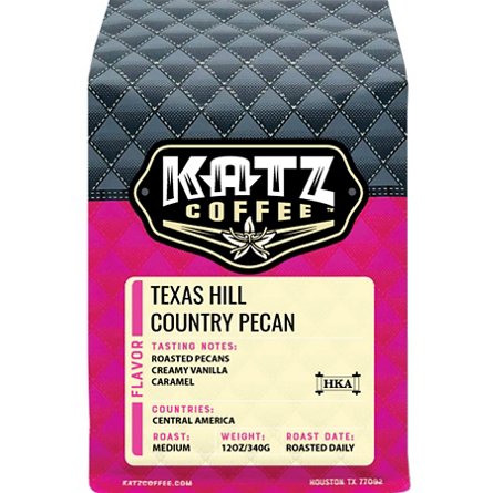 Katz most popular flavored coffee, the Texas Hill Country Pecan, has flavor notes of roasted pecans, creamy vanilla, and caramel. A subtle touch of cinnamon and nutmeg complements the aroma of caramel to create a flavor experience that’s out of this world.