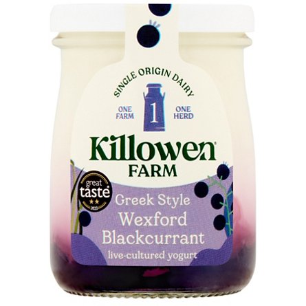 Killowen's delicious velvety creamy live yogurt is made with Irish cream and milk in Wexford, layered over a Blackcurrant compote, and served in a glass jar.