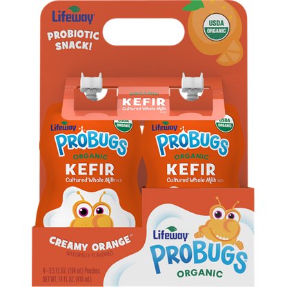 Made with organic ingredients and 1g of added sugar per ounce, Organic Goo-Berry Pie ProBugs Whole Milk Kefir is the perfect go-to snack. This creamy kefir is high in protein and calcium and low in lactose. Each no-spill pouch has 12 live and active probiotic cultures to help support digestion.