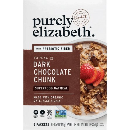 Purely Elizabeth's Dark Chocolate Chunk Superfood Oatmeal with Prebiotic Fiber is made with organic oats and provides excellent source of fiber in every serving. Each single-serve packet contains a superfood blend of oats, quinoa, amaranth, chia and flax with organic fair-trade chocolate for an irre...