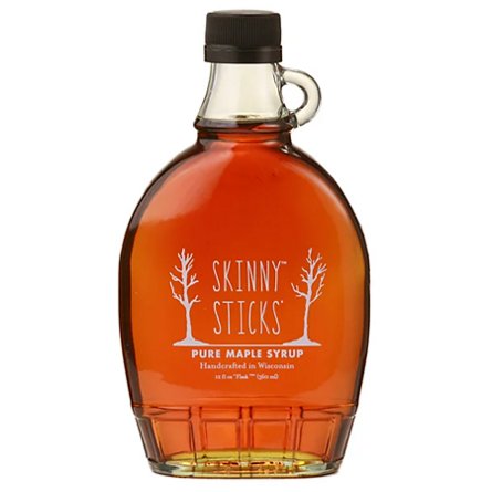 100% pure non-blended Skinny Sticks' Maple Syrup in a traditional 12 ounce maple syrup bottle, always smooth and clean with a gentle finish.