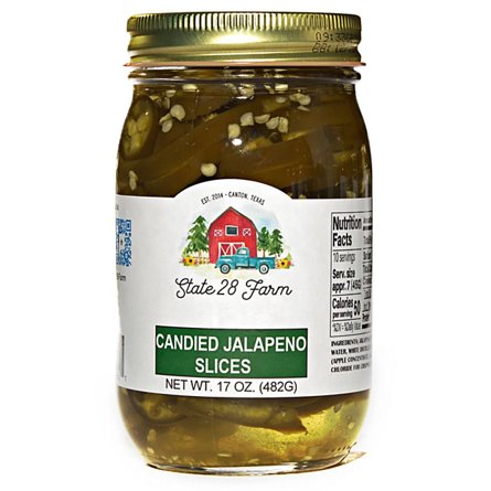 State 28 Farm Candied Jalapeno Slices: sweet, spicy jalapenos in a sugary glaze. Adds a flavorful kick to burgers, nachos, cheese boards, and more. A sweet heat you'll love!