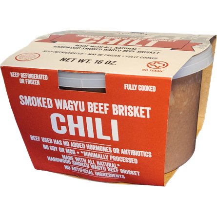 Fully cooked and ready to heat and eat. This chili is made with all natural hardwood smoked brisket. Great enjoyed as is or as a sauce for enchiladas.