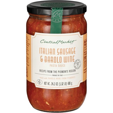 Central Market Italian Sausage & Barolo Wine Pasta Sauce that's crafted with hand-cut vegetables delivers a taste of Piemonte, Italy’s northern region. Spicy Italian sausage, fresh fennel and a generous pour of the region’s Barolo DOCG, the king of Italian red wines, create a luxuriously rich and he...