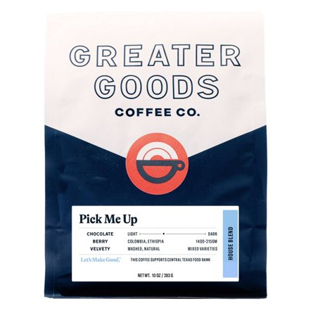 Get introduced to your new favorite roaster with Greater Goods signature house blend. Crafted with sustainably sourced Ethiopian and Colombian coffees, Pick-Me-Up is a little bit fruity, a lotta bit chocolatey, and exactly the right bean for your drip coffee machine.