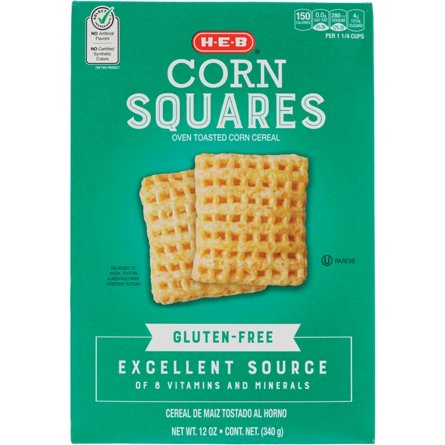 Offering an excellent source of 8 vitamins and minerals, H-E-B Corn Squares cereal is great for breakfast time and more. Oven-toasted for that crisp crunch, these puffy, gridded squares are a key ingredient for making your favorite party snack mix (see recipe below). Gluten-free.