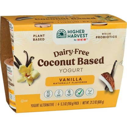 Containing live probiotics, Higher Harvest by H-E-B strawberry yogurt is both dairy-free and lactose-free, since it’s made with coconut milk. Smooth and creamy, it’s suitable for both vegan and gluten-free diets. Add this 4-pack of individual cups to your cart for a plant-based yogurt alternative — ...