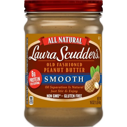 Laura Scudder's Old Fashioned Smooth Peanut Butter is all natural and made with just peanuts and salt. You may notice some oil separation and that's ok. Just give it a good stir and enjoy in sandwiches, on toast and with apple slices as a dip.