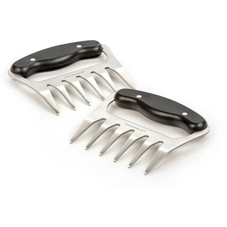 Made of durable stainless steel with wood handles. Multi-use tool for shredding, holding in place, or even tossing a salad. Handles fit any size hands. Each shredder measures 5.25-inches by 5-inches with prongs are 2-inches long. Dishwasher safe.