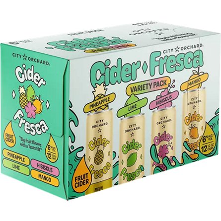 Savor City Orchard’s Cider Fresca Variety 12-pack: crisp apple cider with Pineapple, Lime, Mango & Hibiscus infusions. Experience a burst of tropical zest and floral delights in this perfectly balanced assortment. Refreshment redefined in every sip!