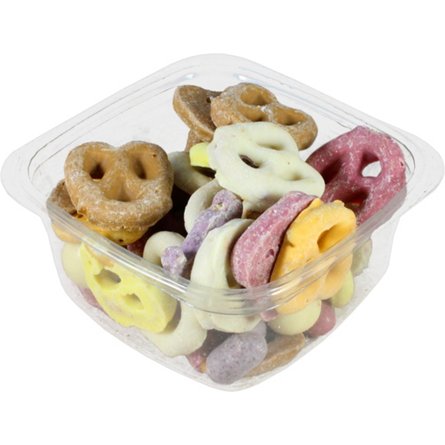Raspberry and Blueberry Yogurt Coatings, Plain Yogurt Coating, Pretzels, Dark Chocolate Coating, Malt Ball, Milk Chocolate, Peanut Butter Coating, Raisins, Pure Food Glaze.